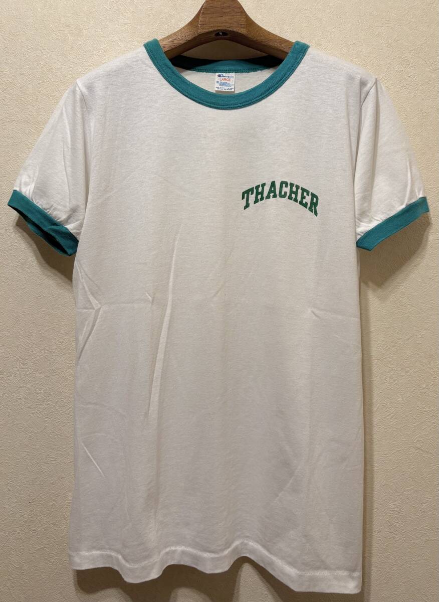 - トリコタグ希少カラーUSA製80sビンテージChampionリンガーTシャツL裾シングル丸胴50/50白トリム青緑レア色US製80年代1980sチャンピオン(70s