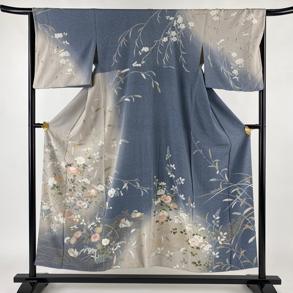 - 訪問着 身丈151.5cm 裄丈66cm M 袷 やまと 草花 流水 金彩 染め分け 灰色 正絹 美品 名品 【中古】