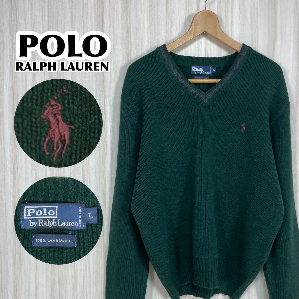> ☆美品☆POLO ポロバイラルフローレン 刺繍ポニー Vネック ウールニット セーター L 深緑 ダークグリーン 襟ライン 90sスタイル 古着