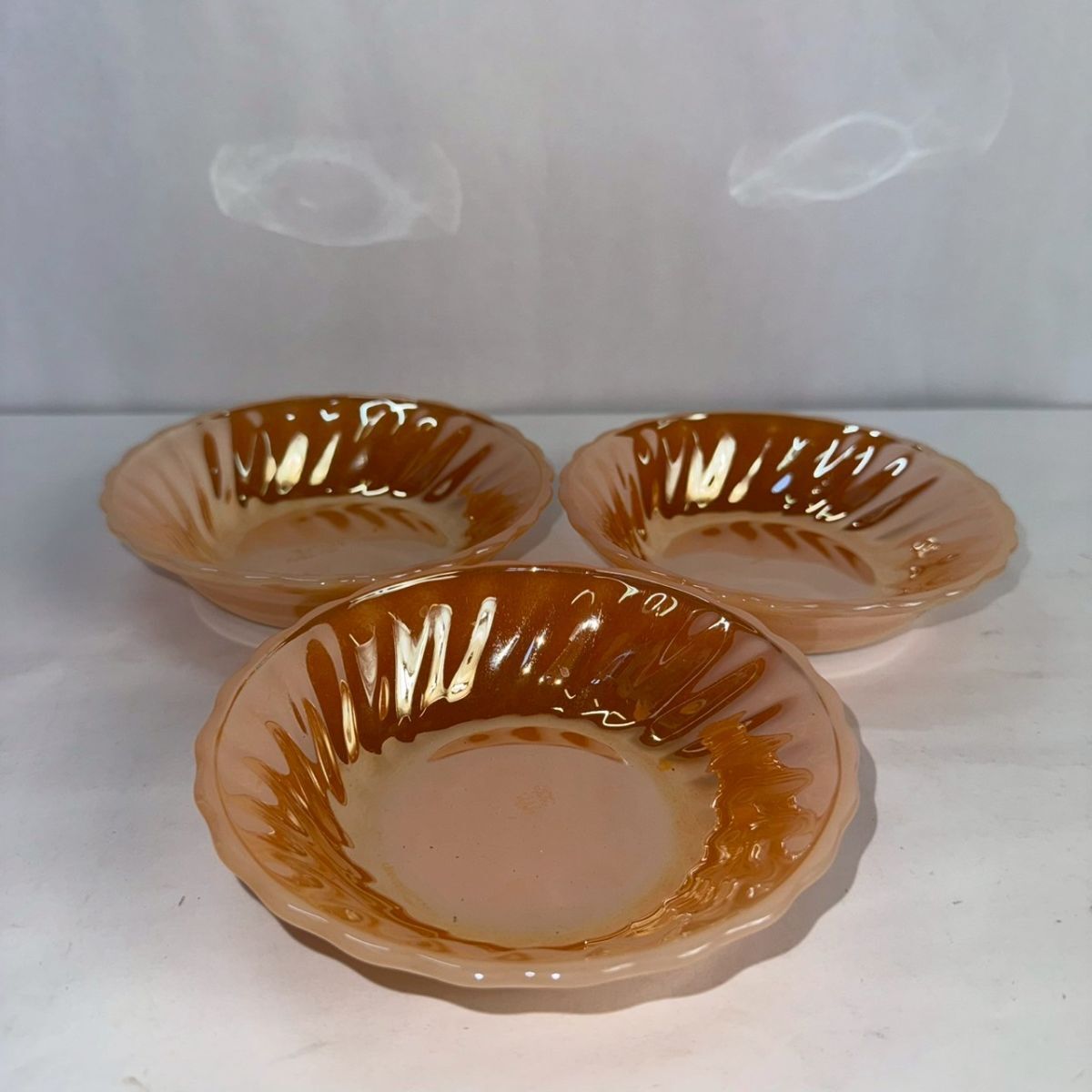 - 小皿 3個セット 3枚 ANCHOR HOCKING アンカーホッキング オレンジ パール光沢 オーロラ アメリカ製 長期保管品 Mp R7730