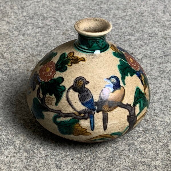 - 九谷焼 青手 角福 菊に小鳥図 油壺 [B28383] 高さ9.5cm 直径10cm ぽってりかわいい形 インテリア 置物 九谷 花器 花瓶 一輪挿し