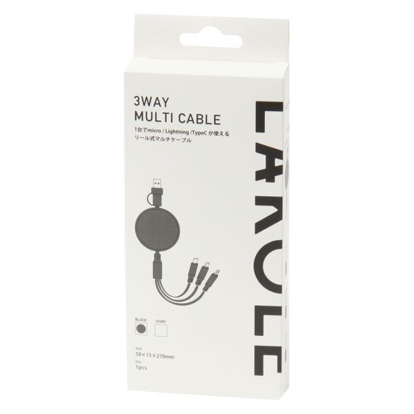 - 送料無料☆美品LAKOLE 3WAY マルチ ケーブル USB Type C/Lightning/USB-A/micro リール式 MULTI CABLEブラック ライトニング スマホ 充電