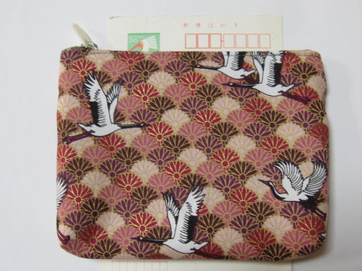 - 手作り ポーチ 菊花 菊 鶴 花 一面 和柄 小紋 模様 絵柄 ツル 鳥 ハンドメイド 財布 小物 充電器 男女 兼用 秋 冬 可愛い 綿 お洒落 祝い