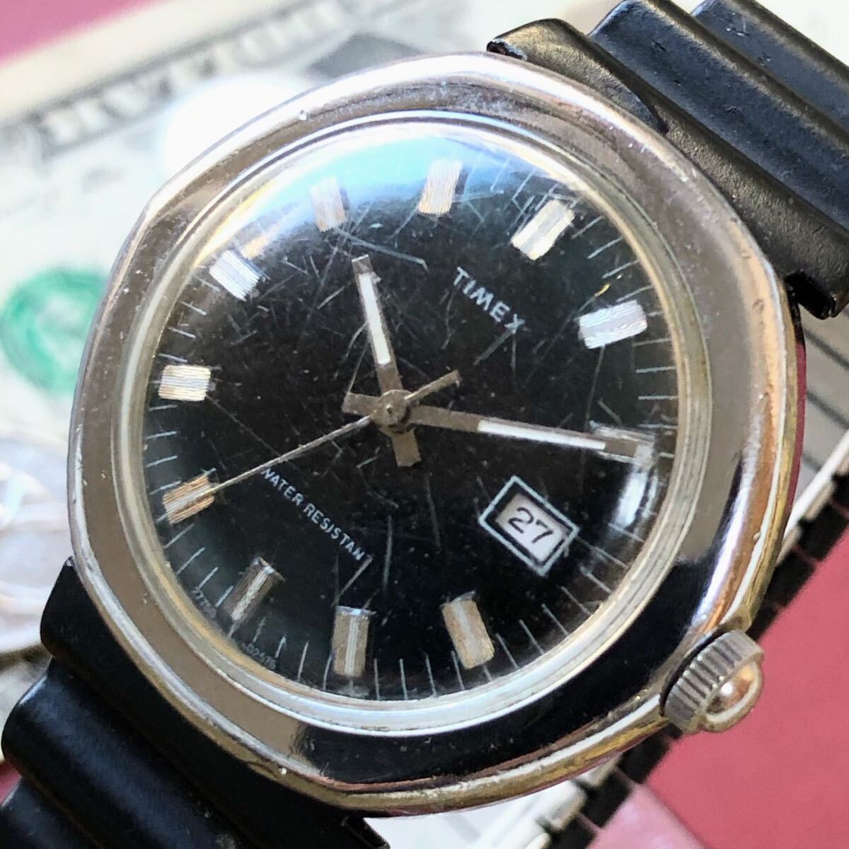 - #3713【人気のブラック】メンズ 腕時計 タイメックス 動作品 手巻き TIMEX アンティーク ヴィンテージ 機械式 1970年代 黒文字盤 DATE 日付