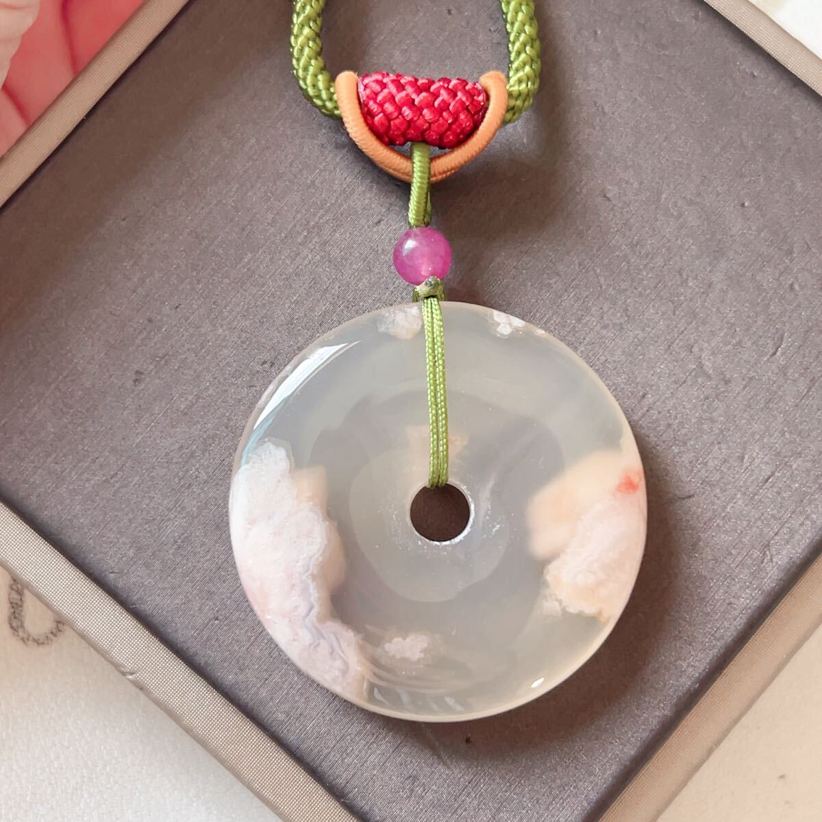 > ◇桜瑪瑙(チェリーブロッサムアゲート)+ カルセドニー ◇ネックレス◇ 平安扣◇天然石◇パワーストーン◇巾着袋付き◇プレゼント018P73114