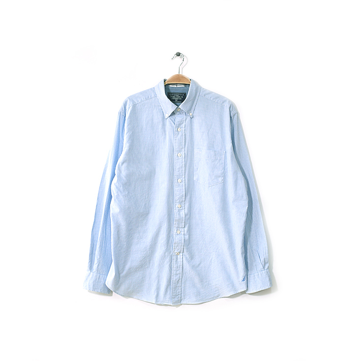 - 【送料無料】ノーティカ コットン BDシャツ ボタンダウン 長袖シャツ チェック柄 刺繍ロゴ 青 ブルー メンズM NAUTICA 古着 CA0779