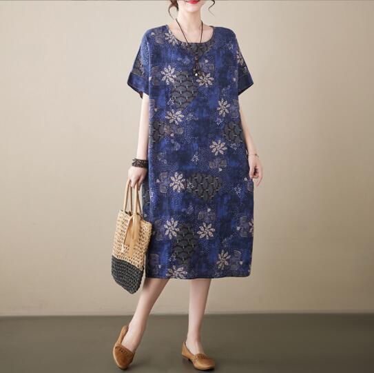- 新入荷上質Fサイズ チュニックワンピース 半袖 レディース 綿麻 プリント柄 可愛い 大人 体型カバー ロングワンピース ブルー