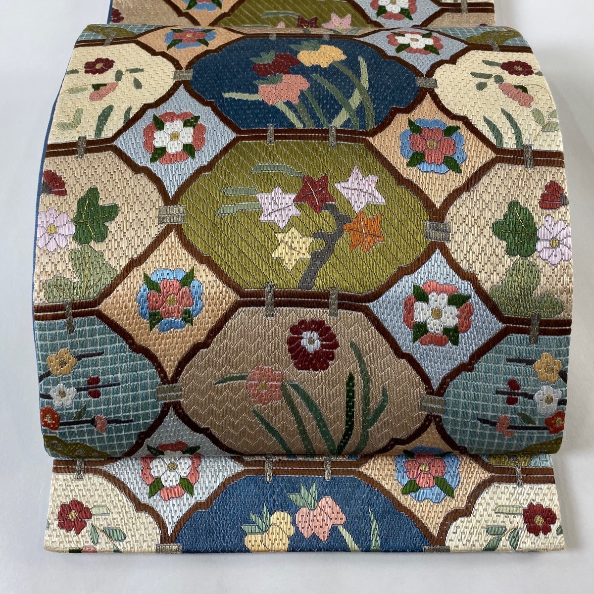 > 袋帯 逸品 草花 金銀糸 刺繍 灰茶 全通 正絹 【中古】