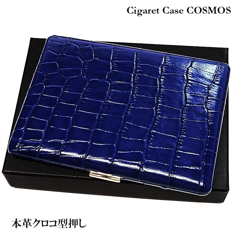 > シガレットケース コスモス 本革 日本製 レザー おしゃれ クロコ型押し ロング 100mm/70mm対応 ブルー 薄型 坪田パール 革貼り 青
