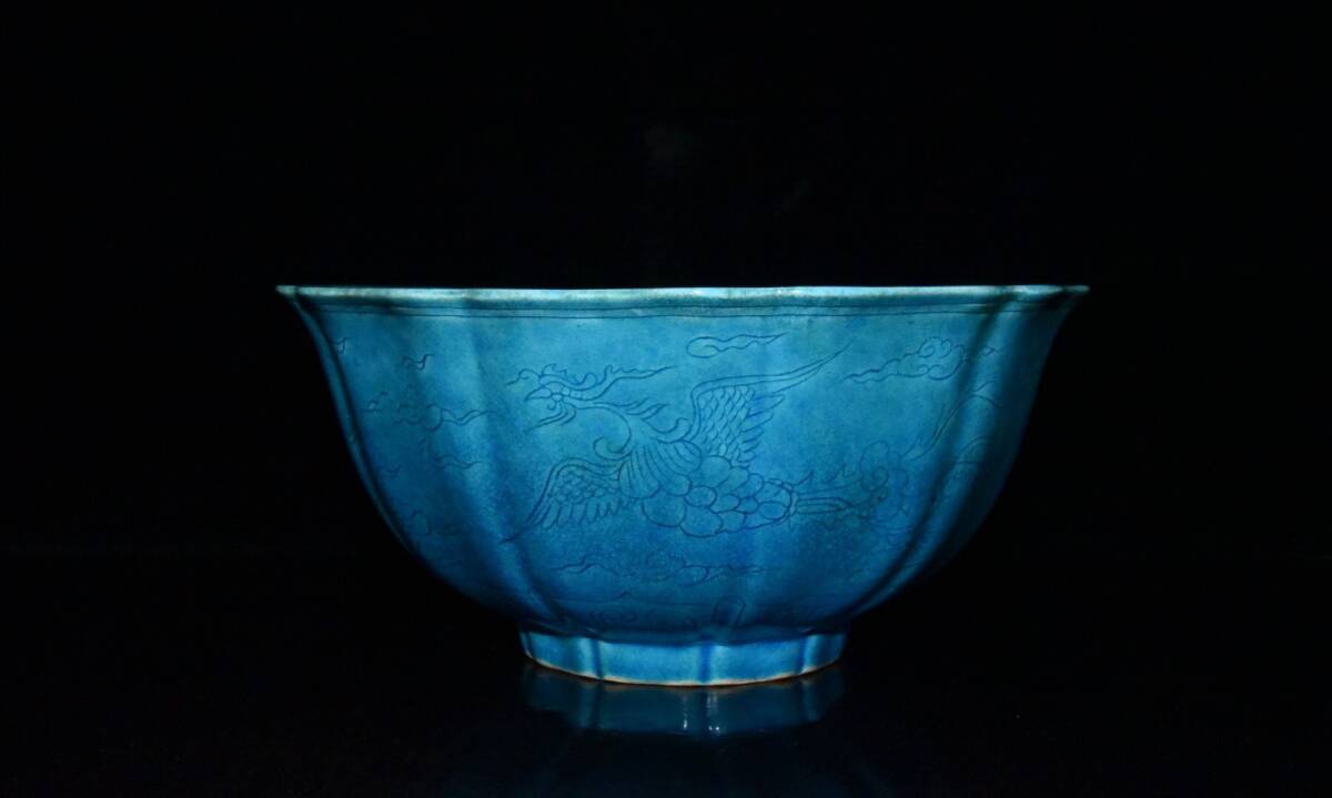 > 蔵友旧蔵出 明 弘治年製款 寶石藍釉 龍鳳紋 瓜角碗 稀少珍品 貴重品 古陶瓷品 置物 古賞物 中国古玩 中国古美術品