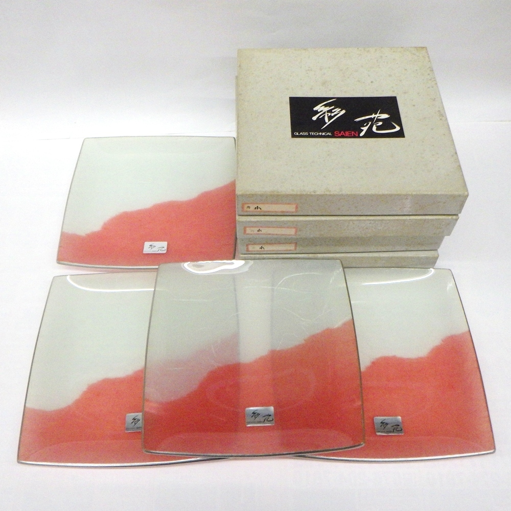 > SI-57【未使用4枚セット】彩苑 かのぎやまん 薄紅 角(中) ガラス皿 スクエアプレート 和紙模様 中サイズ 23.5×23.5cm 正方形 保管品