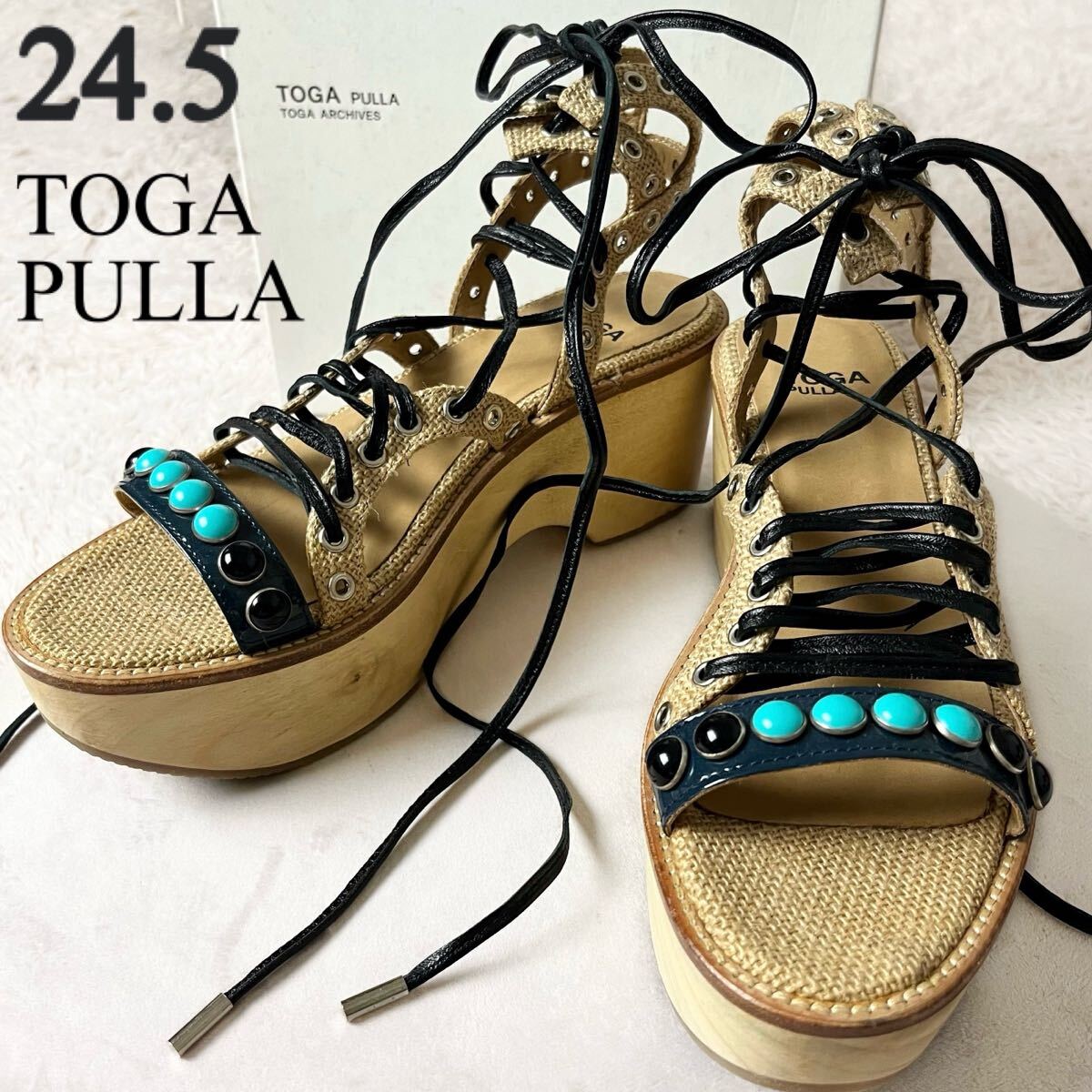 > TOGA PULLA トーガプルラ 厚底 プラットフォーム サンダル レースアップ リボン編み上げ ウッドソール レザー ストーン ビジュー 38 24.5