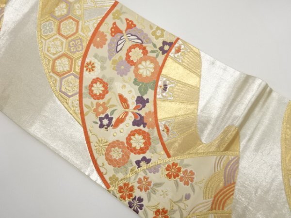 - ys7471787; 宗sou 片輪車に蝶・菊・枝垂れ桜模様織出し袋帯(材料)【アンティーク】【着】