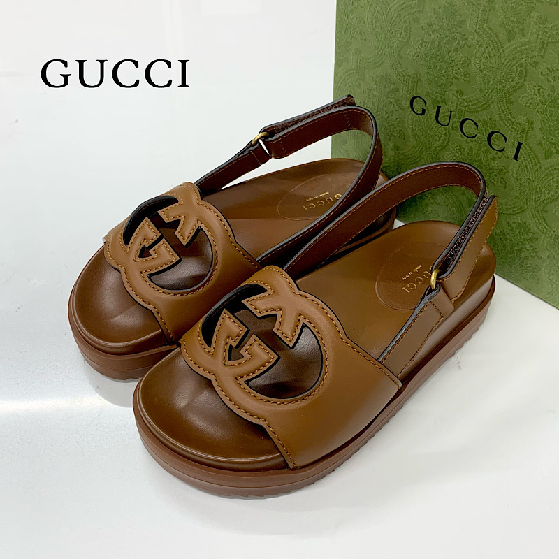 - M12763 グッチ レザー ロゴ ベルクロ サンダル ブラウン