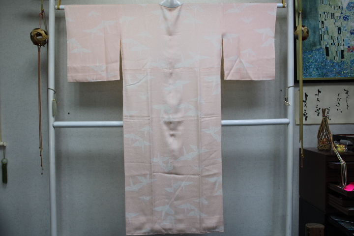 > きもの今昔8863 長襦袢 バチ衿袖無双身頃裏付袷仕立 正絹高級紗綾型綸子地ローズピンク色地折鶴の柄 身丈140CM