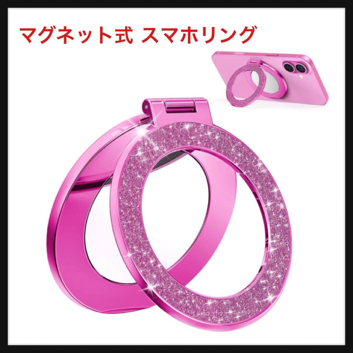 > 【開封のみ】Meifigno ★マグネット式 スマホリング [ミラー内蔵 & Magsafe対応] [電気メッキ&グリッター] 360度回転式 マグセーフ ピンク