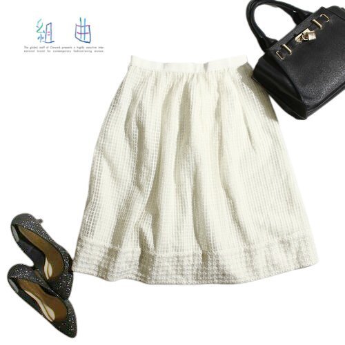 > 美品 組曲 クミキョク 株) オンワード樫山 春 夏 清楚 刺繍 格子柄 Aライン フレアスカート 1 S ホワイト 白 フォーマル オフィス 通勤