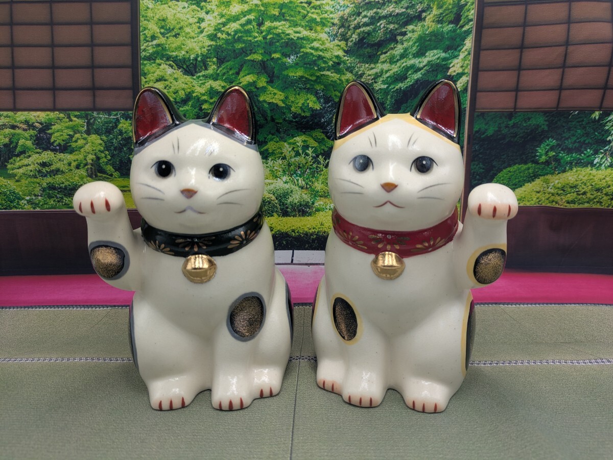 - 招き猫 陶彩菊花招き猫 緑右手上げ大 赤左手上げ大 2種セット 薬師窯
