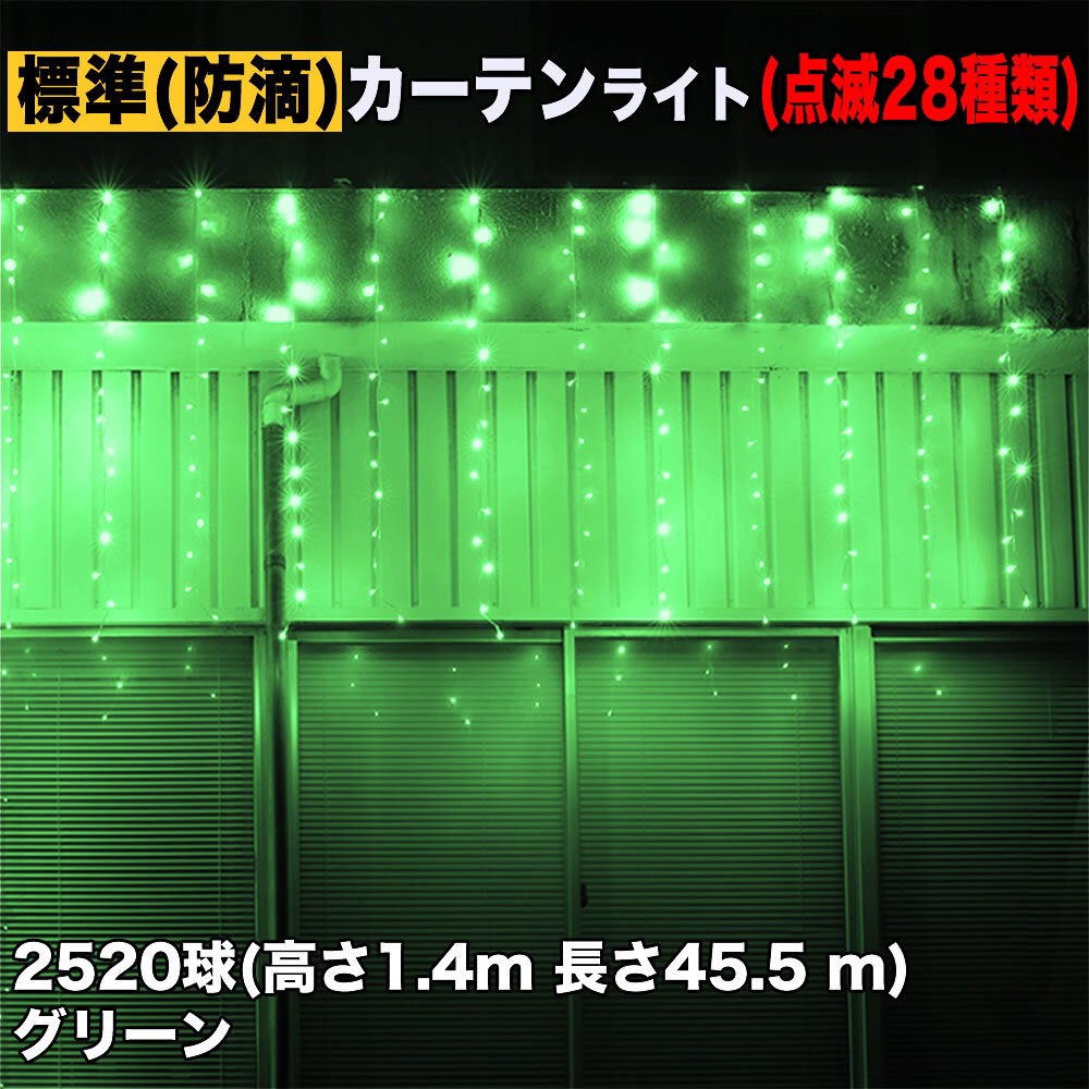 > クリスマス イルミネーション 防滴 カーテン ライト 電飾 LED 高さ1.4m 長さ45.5m 2520球 グリーン 緑 28種類点滅 Bコントローラセット