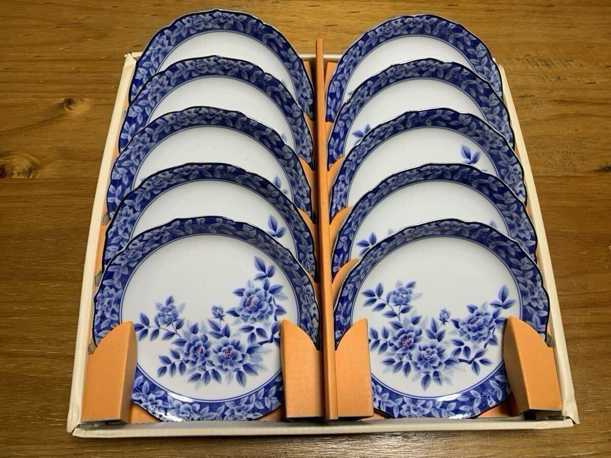 - 未使用品 中皿 10枚セット 青い花柄 陶磁器 和食器 来客 おもてなし 会食 昭和レトロ
