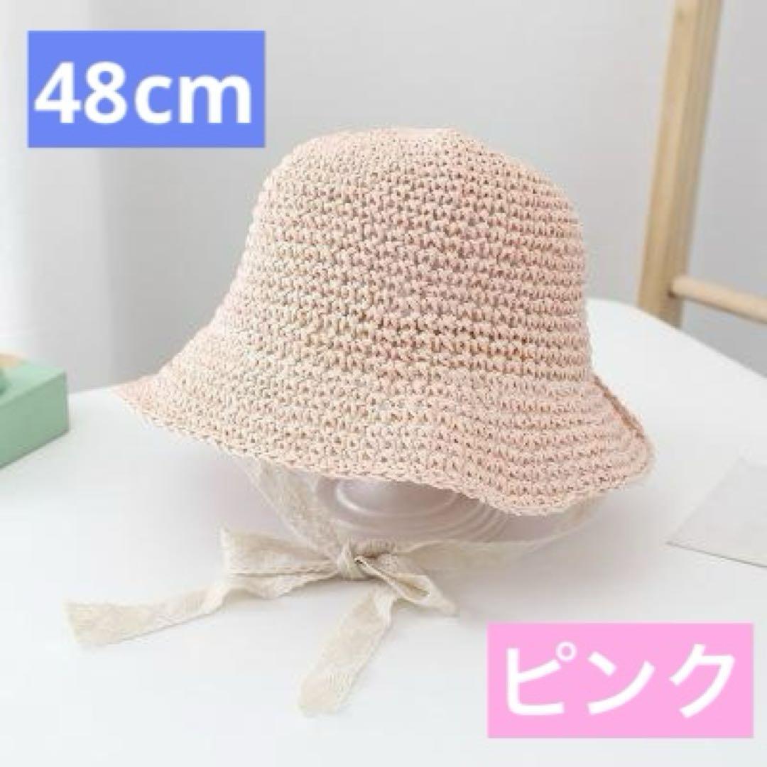 - ピンク 麦わら帽子 ベビー キッズ 1~3歳 48cm 女の子 紐 リボン付き 子供用 夏 帽子