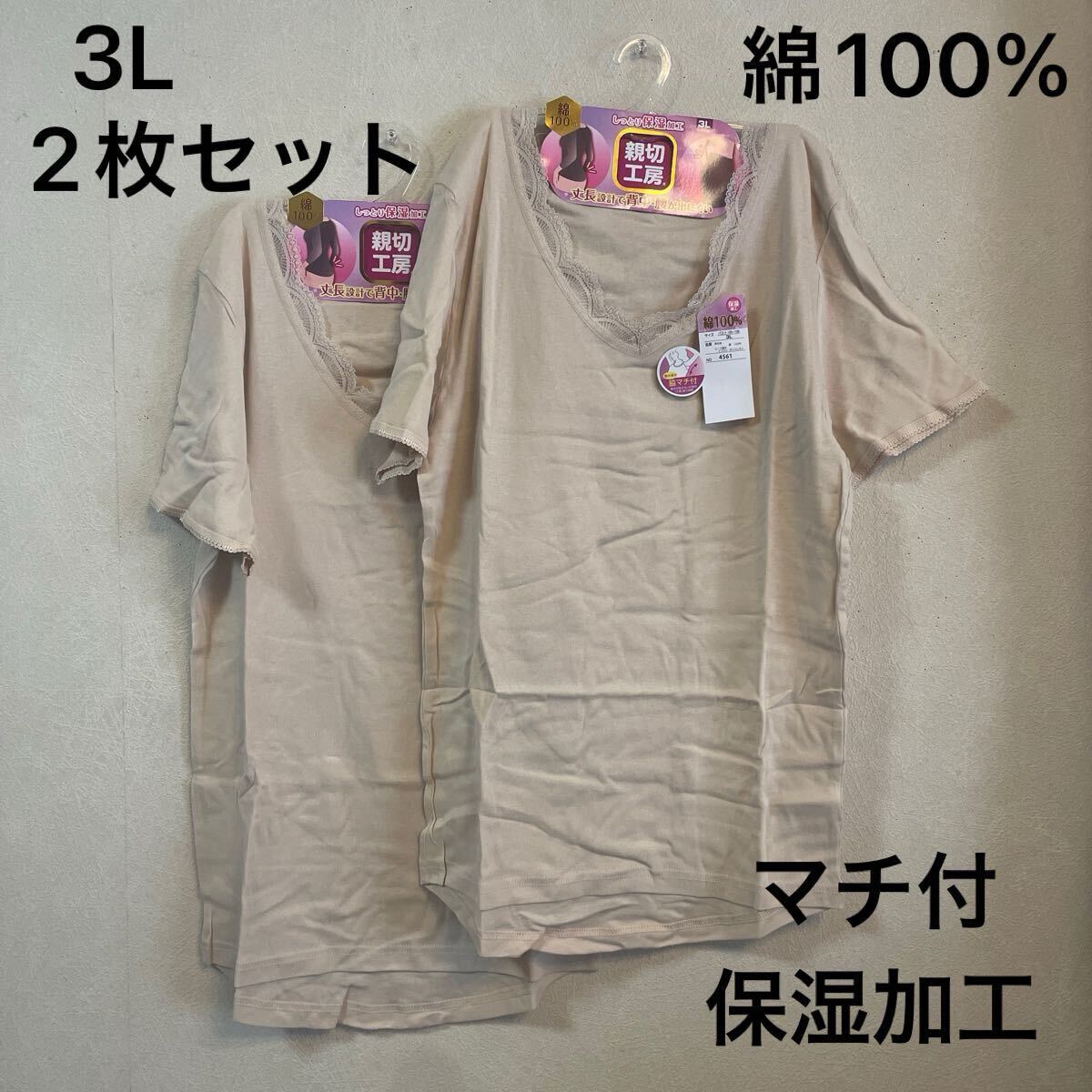 - 2枚組 婦人 肌着 レディース インナー 半袖 3分袖 シャツ レース付 3L 綿100% フライス編み 保湿加工 脇マチ付 後身長め モカ 女性用