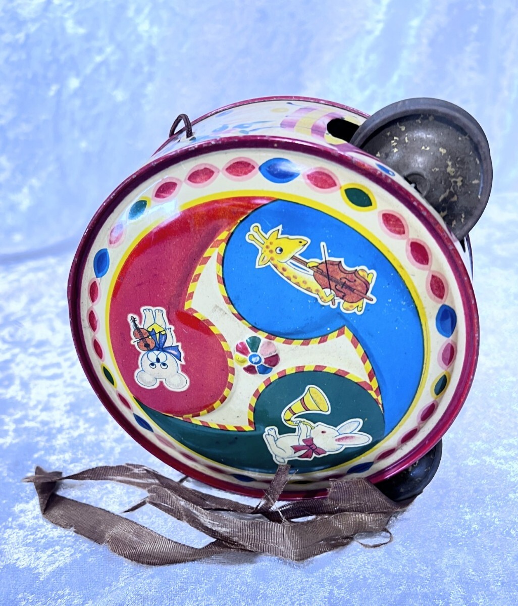 - 【雑貨・おもちゃ】おもちゃのタンバリン ブリキ製 動物たちの楽団のデザイン 古いおもちゃ 昭和レトロ ディスプレイ 骨董品 アンティーク