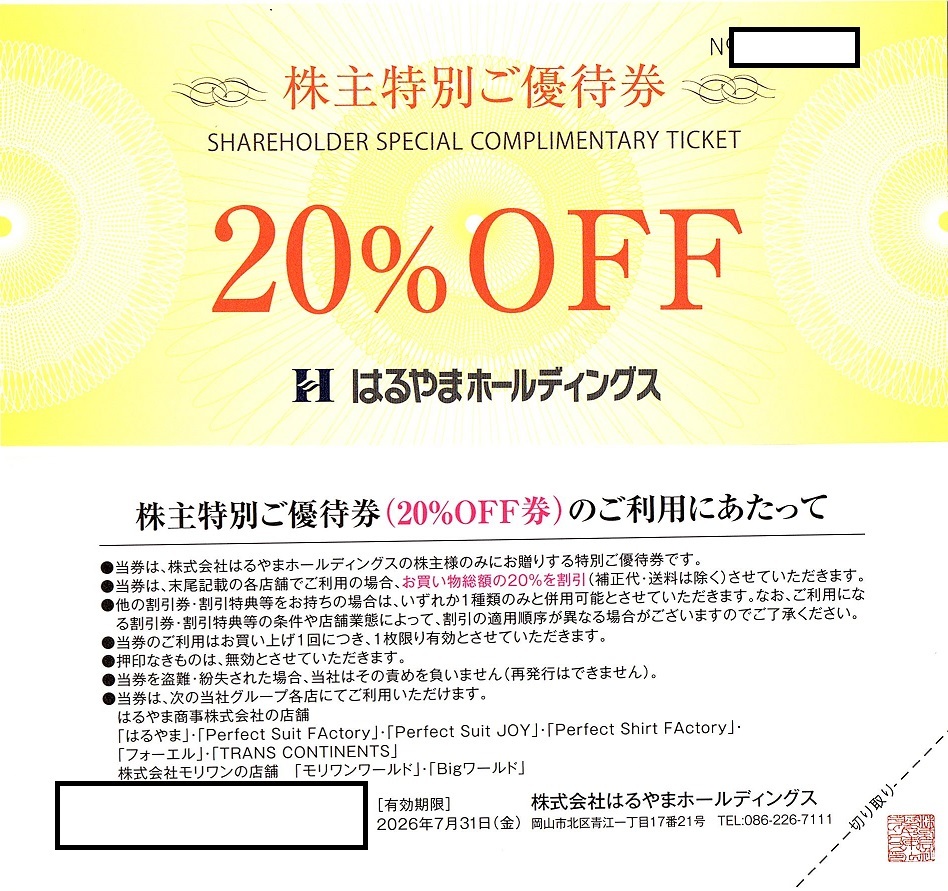 > はるやまホールディングス 株主優待券 20%割引券 2枚set ~5組迄 2026年7月末迄有効 Perfect Suit FActory他