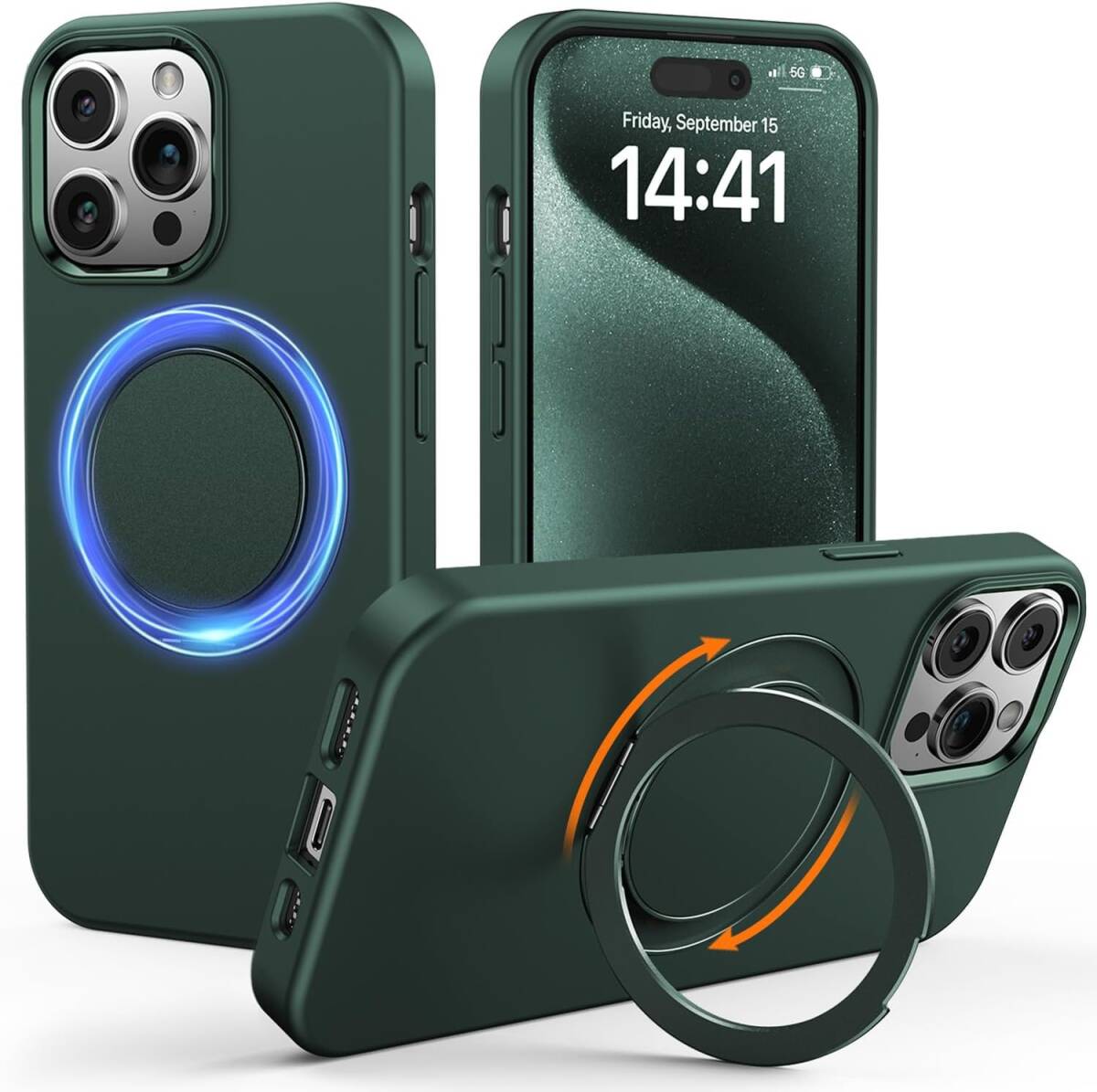 > iPhone 15 Pro Max ケース【360°回転スタンドMagSafe対応】スマホケース 米軍MIL規格 ワイヤレス充電 車載ホルダー 対応マット感 グリーン