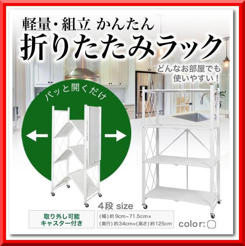 - 【新品】折りたたみ 収納 ラック 4段 スリム スチール キッチン 軽量 (ホワイト)