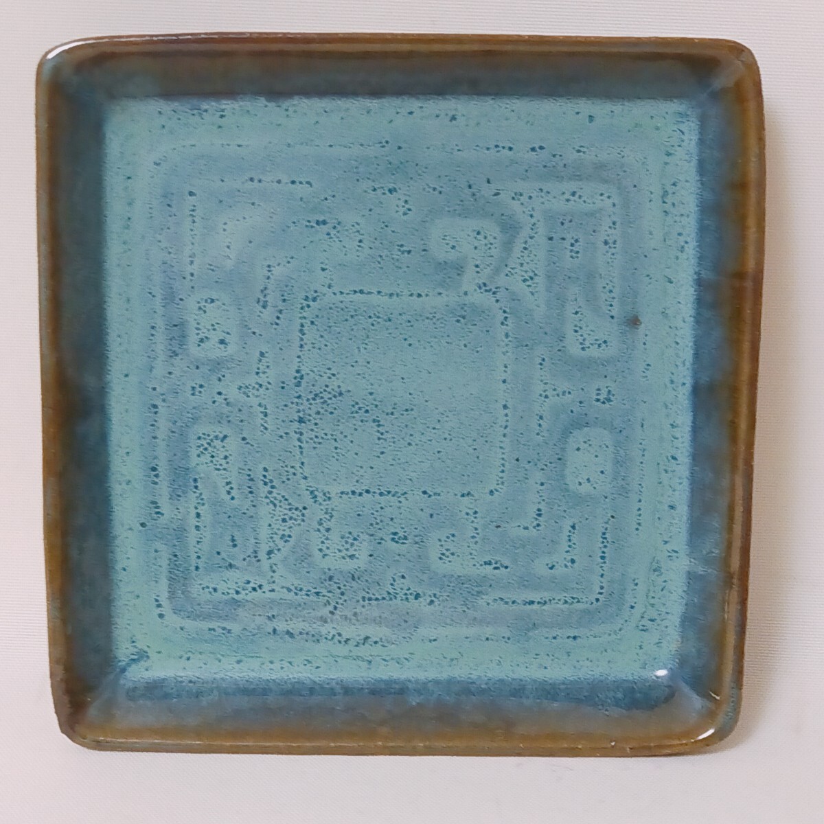 - ★ポツ有★ 小樽窯 アイヌ文様 角皿 均青釉 白勢栄悦 北海道小樽市