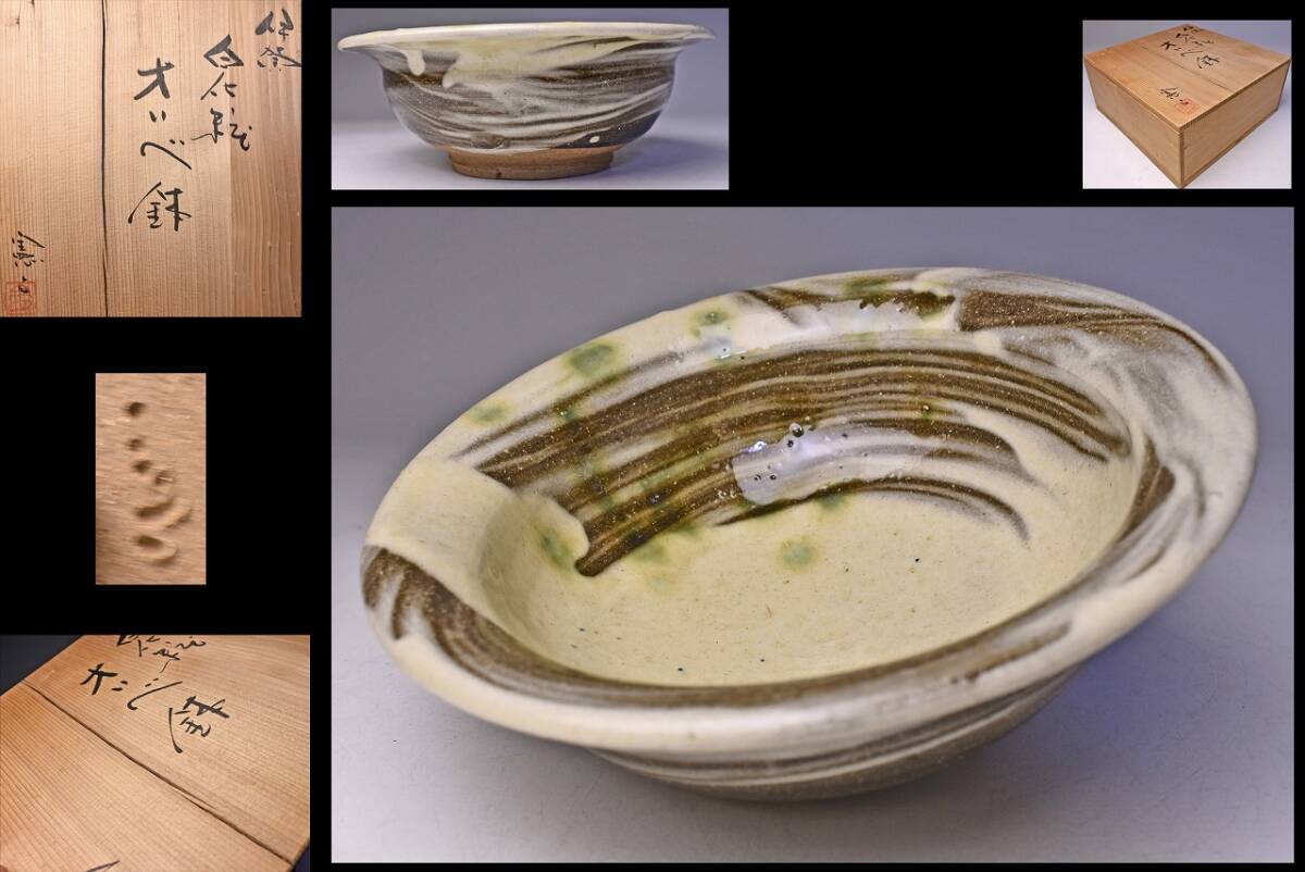 > 小島憲二 ★ 伊賀白化粧オリベ鉢 ★ 共箱 ★ 刷毛目 ★ 織部 ★ 備前焼 小西陶蔵 師事 ★ 三重県文化功労賞 受賞