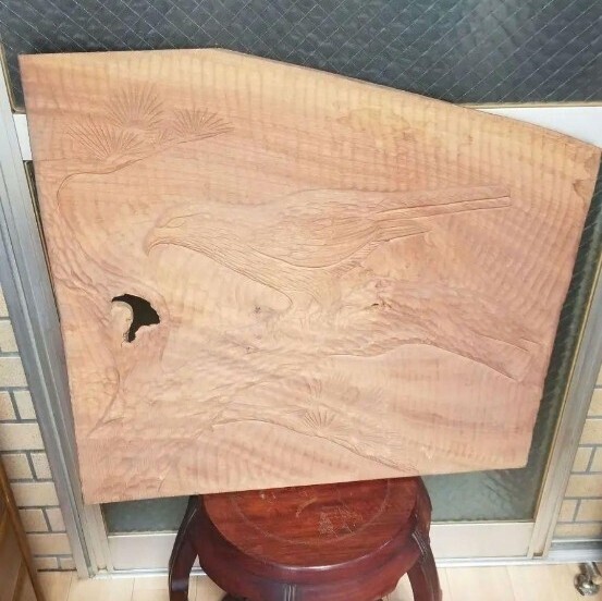 - 一枚板 銘木 天然木 骨董一枚板から彫刻された鷹です