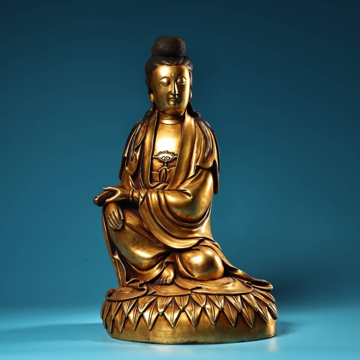 - TM8#6959【3.1】中国骨董 人間国宝 [大明款純銅高浮彫り鏨花全金観音菩薩像 ] 銅器 金属工芸品 古玩收藏 復古 置物 純銅鋳造 開運風水