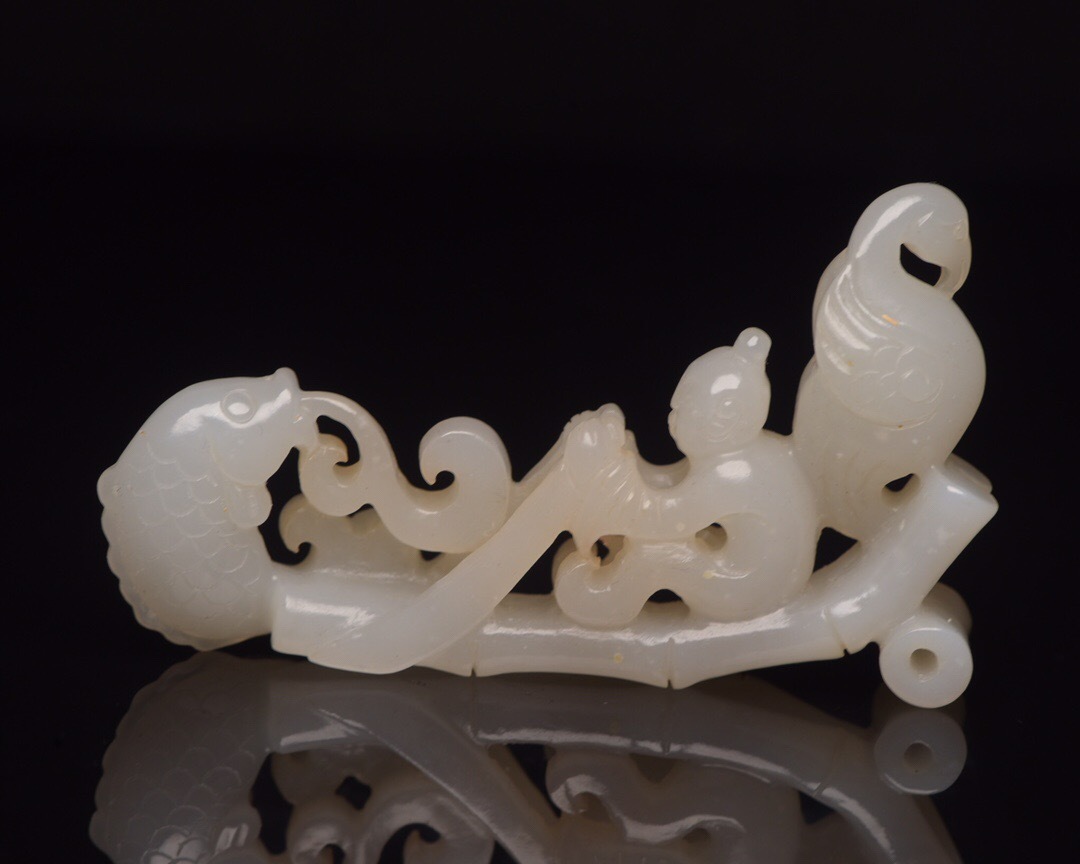 - 『館蔵珍品 和田玉製 細密彫 童子戲魚 置物 賞物』稀少珍蔵品 古賞物 貴重物品 収蔵品 中国古美術 時代物 古董品