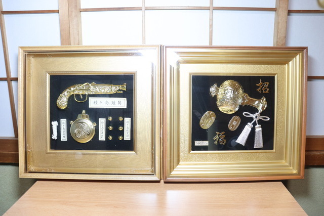 - 昭和レトロ コレクション2個セット 種子島短筒 火縄銃 火薬入れ 実弾 レプリカ 招福 小槌 24金 メッキ 美術品 額縁 縁起物 アンティーク