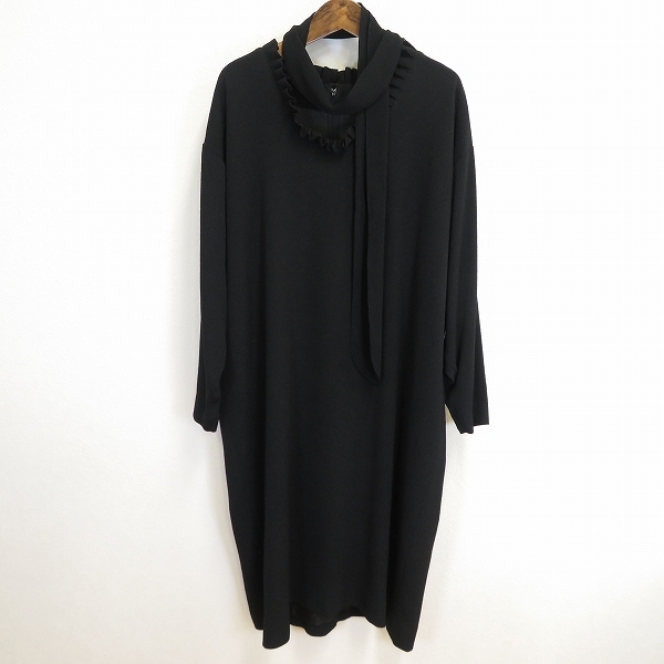 - #a 三年坂 サンネンザカ ワンピース F 黒 ロング 大きいサイズ フリー ちりめん 和風 無地 フリルカラー マフラー付き 日本製 [962992] k01
