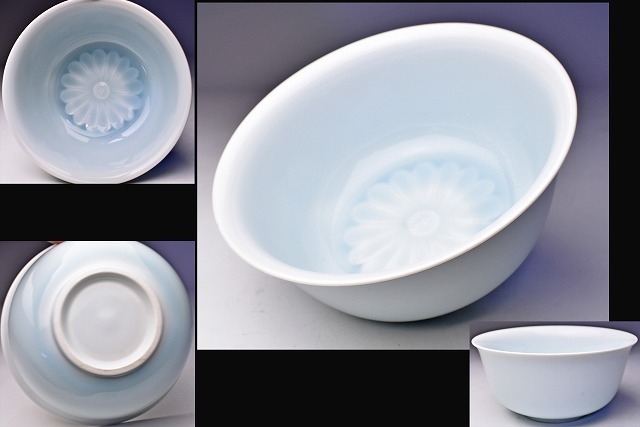 > 塚本快示窯 か ★ 快山窯 か ★ 青白磁 鉢 ★ 花文 ★ 美しい水色 ★ 見込みに大きな花模様 ★ 爽やかな雰囲気の逸品 ★