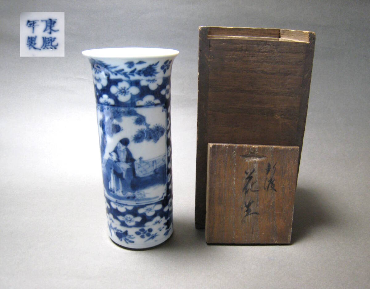 - 中国古玩 康熙年製 人物 風景 青花 染付 花入 花瓶 15.5cm 新渡 中国美術 清代 明代 清朝期 委託