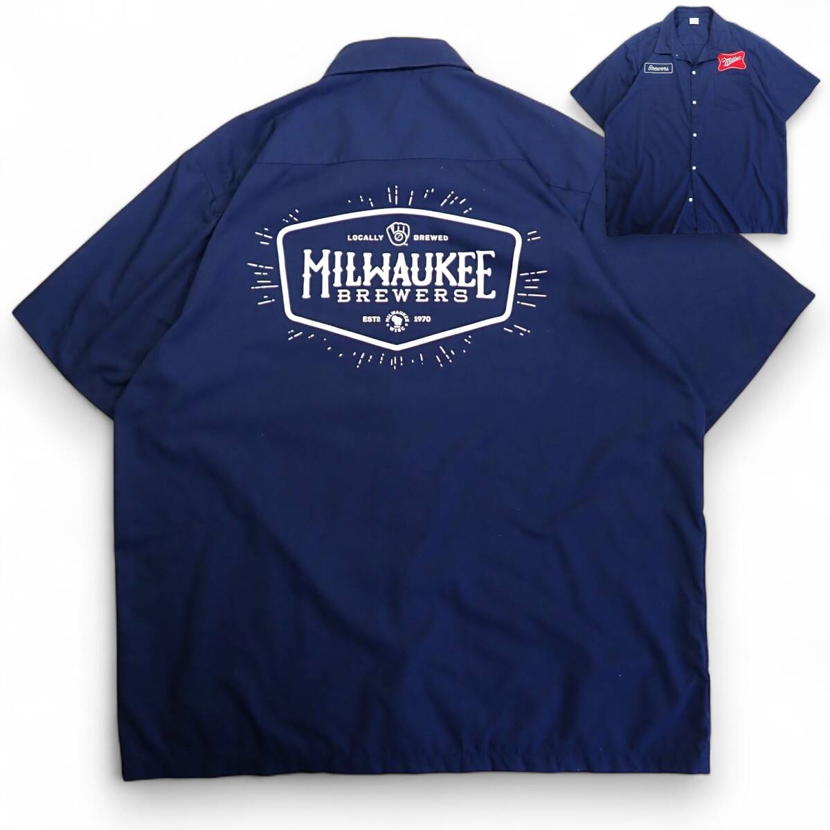> 6962/EAGLE PROMOTIONS 半袖 ワークシャツ XL●フロントワッペン バックプリントMiller MILWAUKEE BREWERS●洗濯プレス済●古着