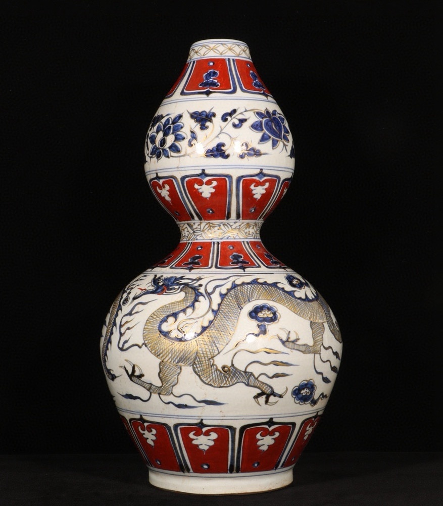 - 時代旧蔵 元時代 白滸孤窯 青花描金 龍紋瓢箪瓶 古陶磁器 珍品旧蔵 古賞物 時代物 819