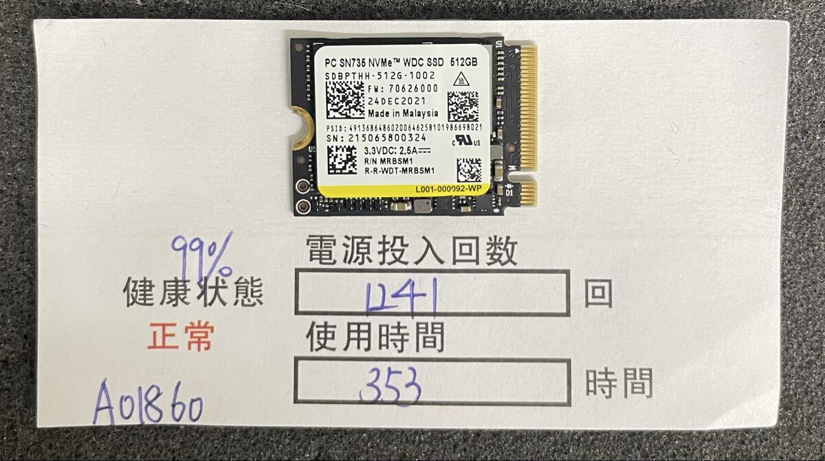 > A01860/中古品/ M.2 NVME 2230 SSD/WD/512GB/動作確認済み/返品返金対応/納品書発行可(商品説明文ご確認下さい)