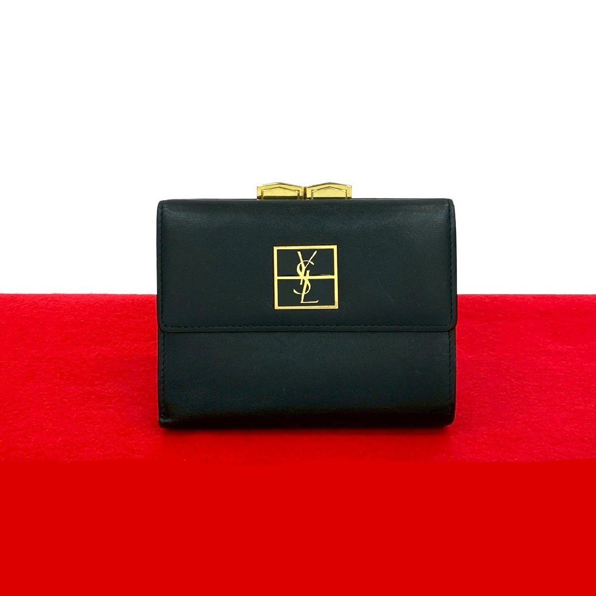 > 極 美品 YVES SAINT LAURENT イヴサンローラン ヴィンテージ YSL ロゴ 金具 がま口 レザー 本革 二つ折り 財布 ウォレット ブラック 41759