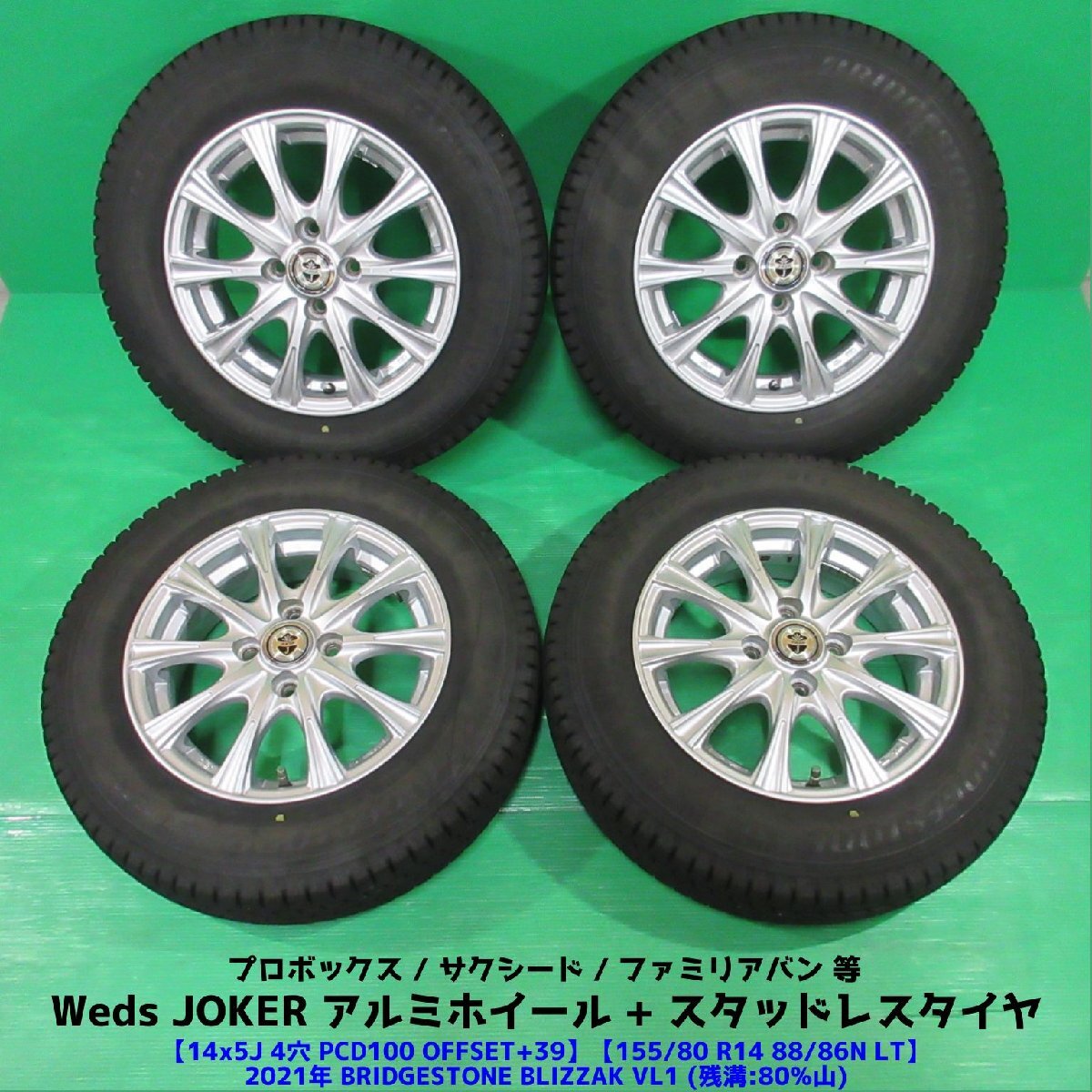 - 良品 プロボックス 155/80R14 88/86N LT バリ山スタッドレス 80%山 BRIDGESTONE BLIZZAK VL1 4本 4穴PCD100 5J +39 サクシード 中古新潟