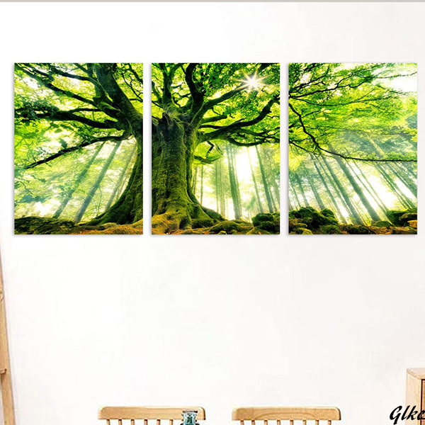 - 【森の緑を感じる3枚組アートパネル】 自然風景画 40×60cm 3枚セット 緑のインテリア 風水 開運 木製フレーム 新築祝い
