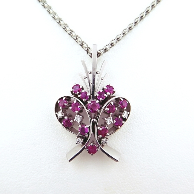 > Pt850/900★プラチナ ネックレス リボンモチーフ ルビー1.690ct 7月誕生石 ◇ダイヤモンド チェーン長38cm【中古】/m9128/19369/10002269