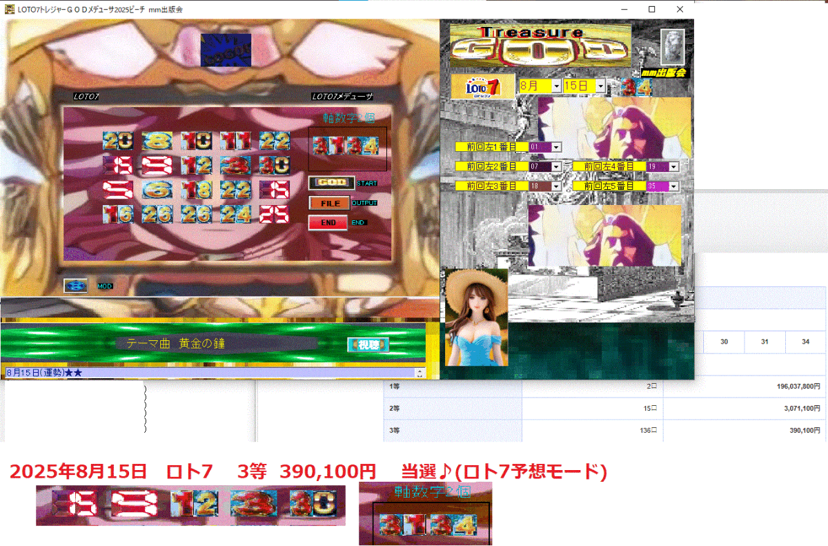 - 新作[LOTO7トレジャーGODメデューサ2025ピーチ] ロト7専用予想ソフト 2025年8月15日 ロト7 3等 390,100円 当選♪