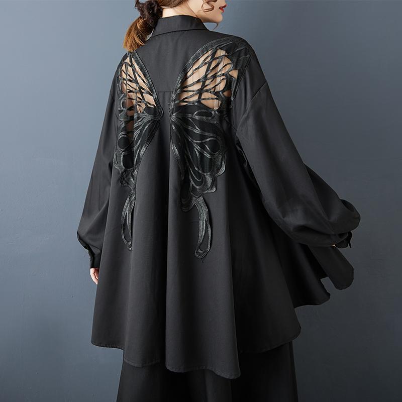 - 新品 大きいサイズ トップスゆったり 蝶 バタフライ柄 シャツ 黒長袖夏秋