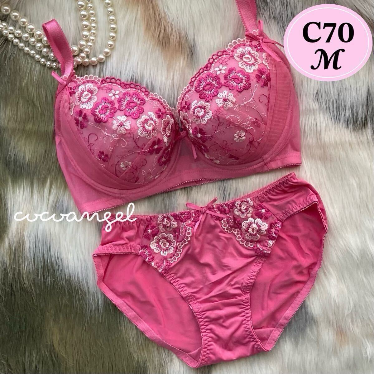 > ラスト【C70M 濃ピンク】新品 ブラジャーショーツ Cカップ パッドなし かわいいパンティ 花柄刺しゅう 寄せ上げブラ 美バスト 谷間メイク