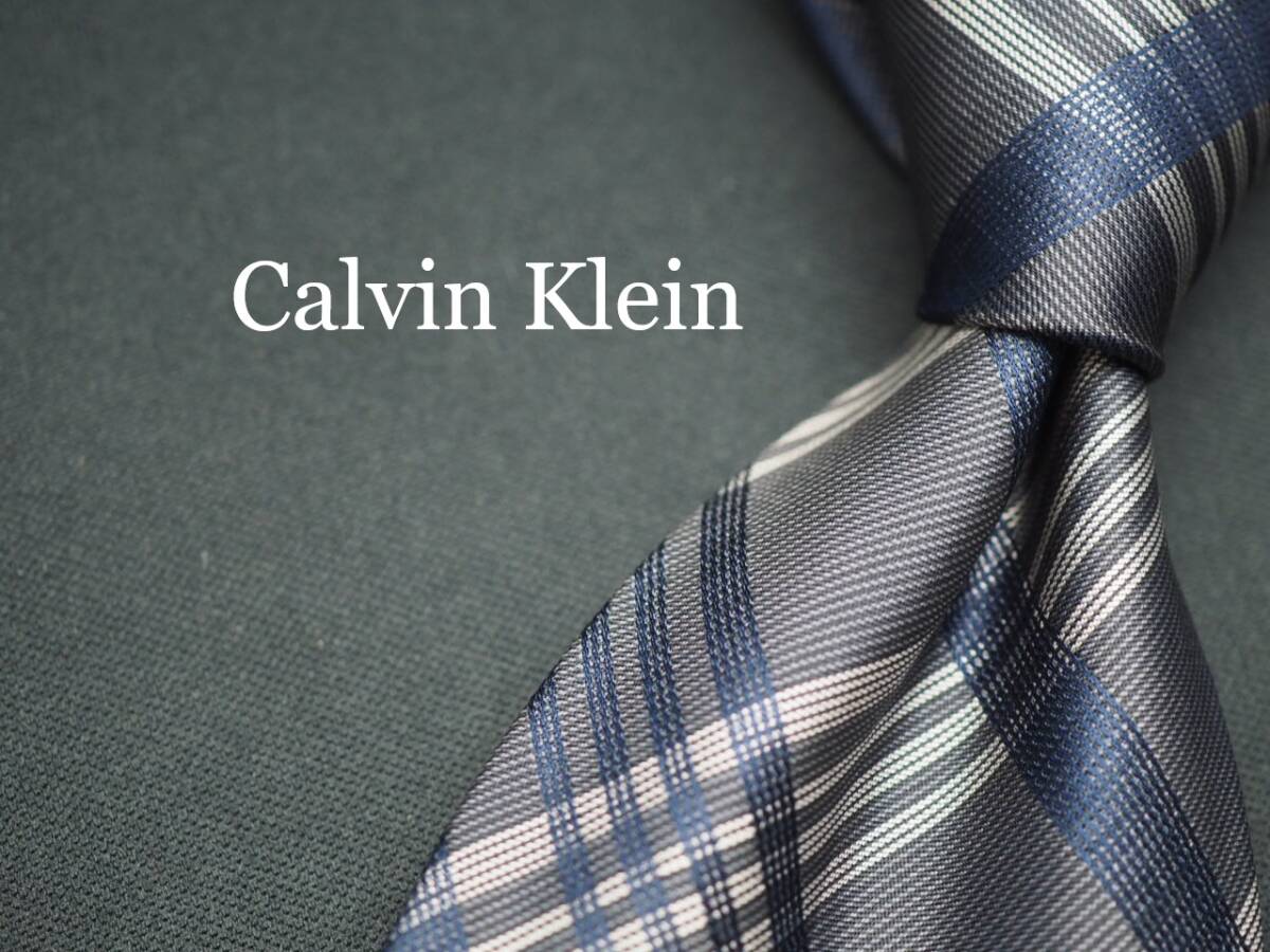 > 美品【Calvin Klein カルバンクライン】 F1552 チェック グレー ネイビー系 SILK ブランド ネクタイ 古着 良品